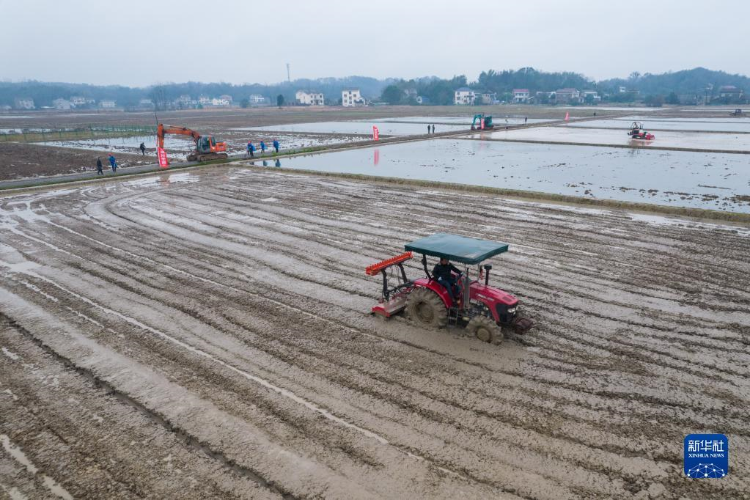 在湖南省常德市桃源县浔阳街道大平村,工作人员驾驶农机平整土地(2022年2月17日摄,无人机照片)。新华社记者 陈思汗 摄
