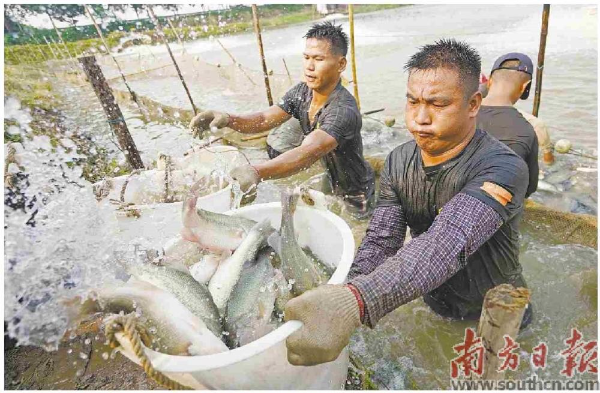 在佛山顺德勒流,工人在捕捞鲈鱼。