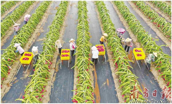 在距离梅州近800公里的湛江,另一种水果正值上市旺季,位于雷州半岛的遂溪县湛江农垦广前公司,地处热带季风气候区,优越的自然环境让这里成为特色热带水果的沃土。时下正值火龙果丰收季节,在广前公司名优水果标准化生产示范基地,一个个鲜红的火龙果挂满枝头,一阵阵采摘的欢笑声不绝于耳。