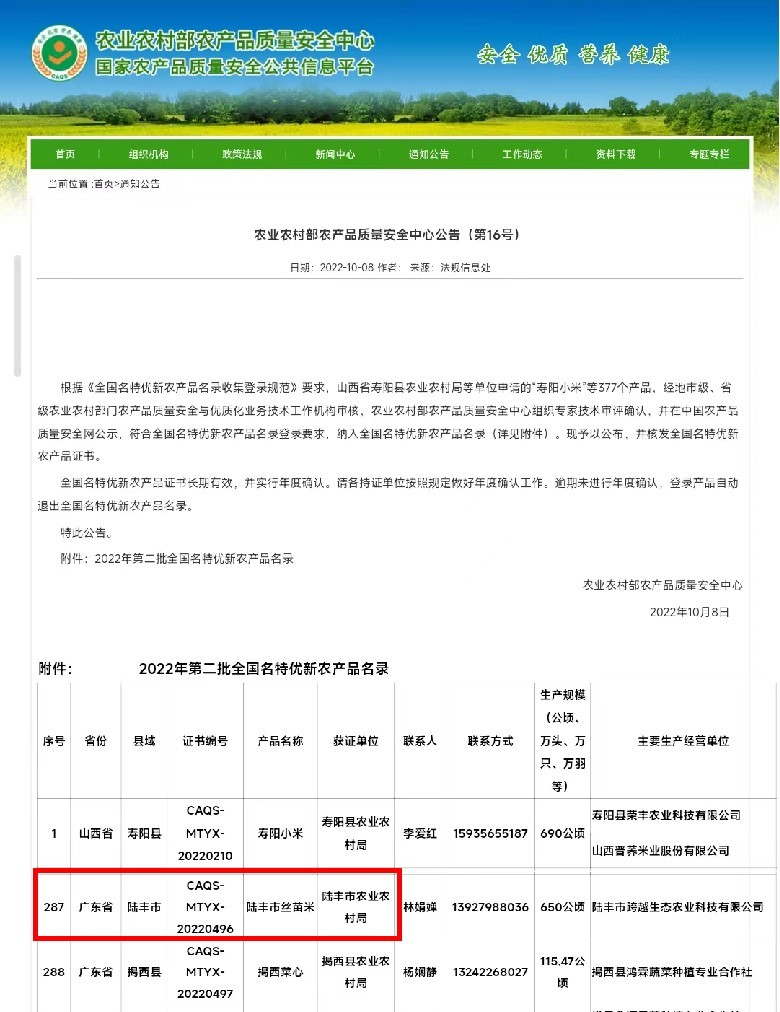 近日,农业农村部农产品质量安全中心发布公告(第16号),公布了2022年第二批全国名特优新农产品名录,“陆丰市丝苗米”入选。此次入选,意味着汕尾丝苗米的品质通过了严苛的农产品质量安全审核,以优异的产品实力获得国家和行业的权威认证。
