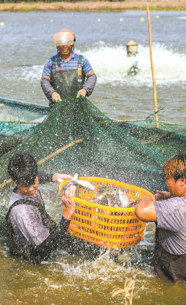 眼下正是白蕉海鲈出塘的季节,现在漫步在珠海市斗门区白蕉海鲈产业园,一个个鱼塘边都能看到正在捕鱼的渔民,随着渔网出水的海鲈鱼翻滚,溅起的水珠在晨曦中闪耀,为金色的丰收季节镀上亮色,到处都是渔民爽朗的笑声。近年来,当地依托省级现代农业产业园建设,以“一村一品、一镇一业”特色产业发展为抓手,深化白蕉海鲈全产业链条整合,推动白蕉海鲈产业转型升级,构建了海鲈产业多元主体共同参与发展格局及完整产业链,海鲈一、二、三产业有力带动从业人员5万多人,初步形成了“政府引导、市场主导、龙头企业带动、小农户深度参与”的运营机制,带动2000余农民人均增收2万多元。一条鱼带动了一个产业,造富了一方百姓,成为中国渔业的一张闪亮名片,走出了一条广东特色的现代农业兴旺之路。
