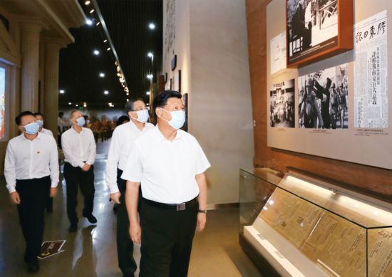 2020年8月18日至21日,中共中央总书记、国家主席、中央军委主席习近平在安徽省考察。这是19日下午,习近平在合肥市参观渡江战役纪念馆,重温革命历史,缅怀革命先辈的丰功伟绩。新华社记者 鞠鹏/摄