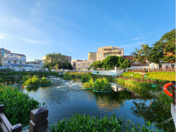 茂南区处于小东江、袂花江下游,农村生活污水治理成效直接影响“两江”水质。“宅前有水,宅后有山”是岭南乡村理想格局,袂花镇椰子村有一口“风水塘”,不仅寄托了当地村民的美好祝愿,更有雨季蓄水、旱季灌溉的实用价值。当地为了治理污水提出“水解酸化池+生态沟+生态塘”的资源化利用模式,将风水塘改造成秀美生态塘,并在农村生活污水处理中心之上建起休闲公园——椰子村龙珠公园。