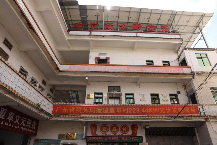 夏阜村委会大楼的楼顶上整齐地安装了光伏板。