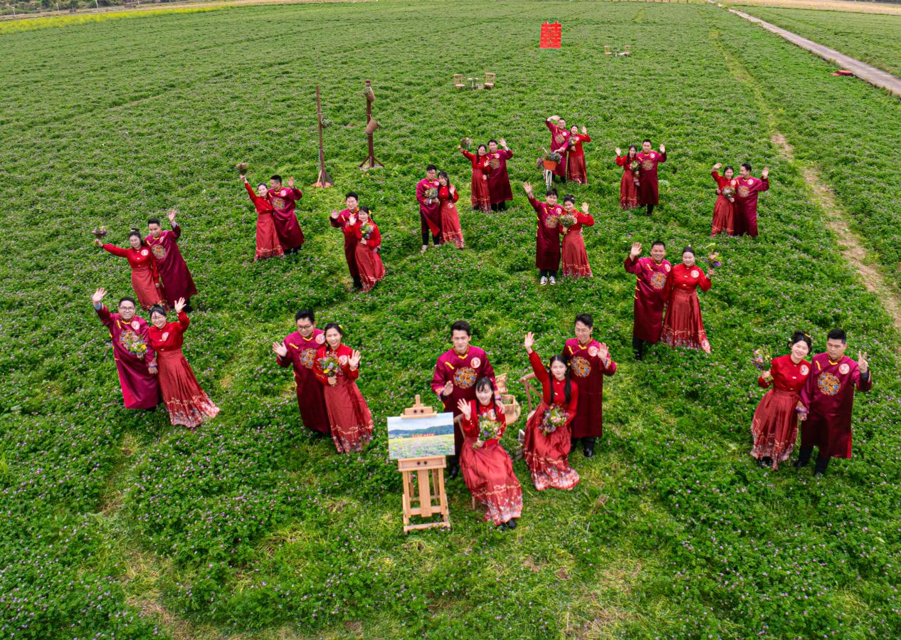 春满岭南,紫云盛放。3月16日,位于河源市东源县柳城镇的万绿智慧无人农场示范基地热闹非凡,数千亩紫云英花海铺就紫色云锦,“紫云花海,映影幸福”乡村绿美文化婚庆活动在此举行。