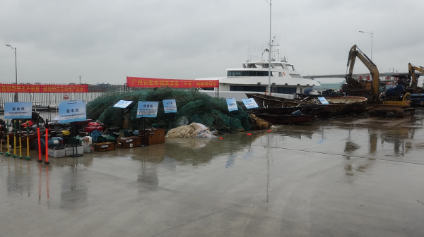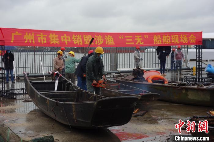 2022年2月21日下午,广州市集中销毁“三无”船舶现场会在番禺莲花山中心渔港举行,主要拆解销毁2021年以来番禺区查获的涉渔“三无”船舶及一批违法捕捞工具、网具。