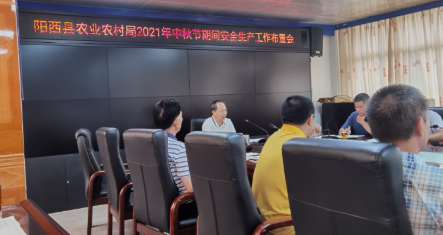2021年9月10日,阳西县农业农村局召开了中秋期间安全生产工作布置会,会议总结了近段时间渔船、农机等安全生产工作,强调了中秋期间安全生产检查,布置了具体的农业安全生产工作。
