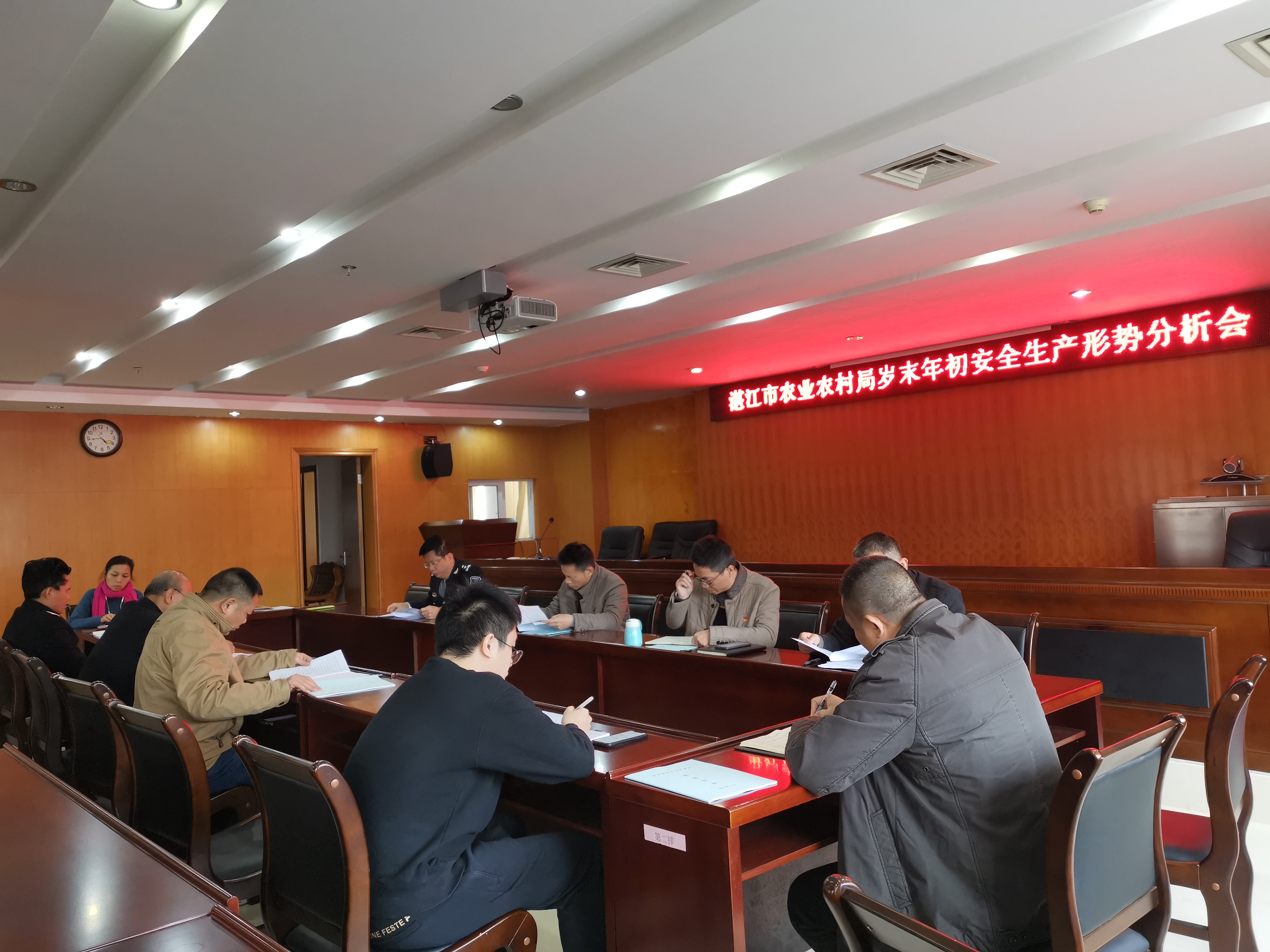 12月17日下午,湛江市农业农村局党组副书记、副局长张贤主持召开了农业安全生产岁末年初形势分析会,会议学习了习近平总书记出席深圳经济特区40周年庆祝大会和视察广东重要讲话、重要指示精神以及关于安全工作的系列指示批示和中央、省、市各级关于做好岁末年初安全生产工作的会议和文件精神。