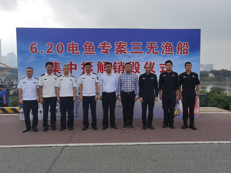 11月19日,为进一步加大典型案件宣传力度,强力震慑非法捕捞等农业违法行为,佛山市农业农村局联合市公安局特警支队、禅城区农业农村局在东平水道水警码头举行仪式,对“6.20”宗亲式涉恶电鱼团伙案查获的7艘“三无”渔船及电鱼设备进行集中拆解销毁。