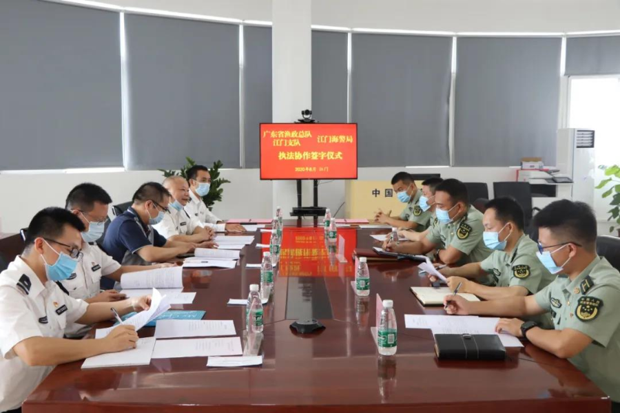 8月4日上午,江门渔政支队和江门海警局召开海上综合执法监管机制研讨会,共同签订了海上执法协作协议。会上,双方分别介绍了各自近年来海上执法工作开展情况,就当前辖区海上执法监管形势进行分析研判,并对海上联合执法的重难点问题进行深入研讨。