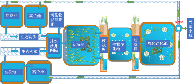 过滤坝:在一级沉淀池与二级生物净化池和三级理化净化池之间建设过滤坝,在坝体中填充大小不一的滤料,滤料可选择牡蛎壳(蚝壳)、碎石、鹅卵石、小石子、棕片、陶瓷珠等填充物介质,能起到吸附污水中的泥浆等作用。