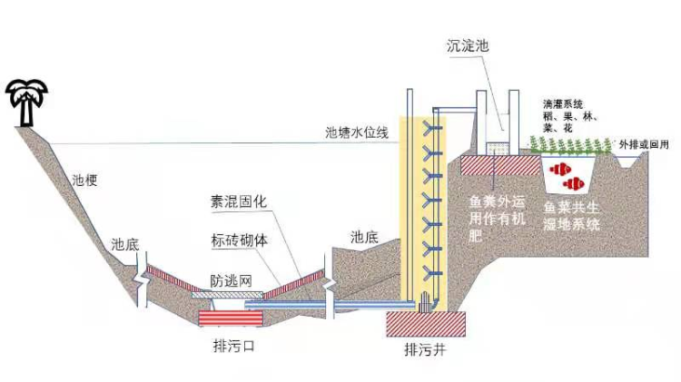 池塘底排污系统包括池塘底部改造、底排污口、排污管道、排污出口竖井、排污阀门等组成。