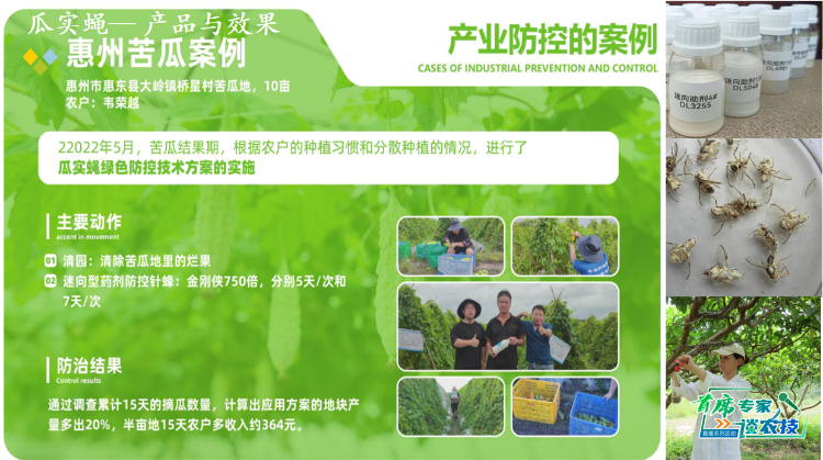 虫害岗位专家章玉苹研究员针对瓜豆蔬菜上的实蝇、豆荚螟、蓟马防治困难原因及存在问题进行详细讲解,给出了综合防控的措施和科学防控的关键技术要点。同时,用“惠州苦瓜案例”来展示具体的做法及效益。