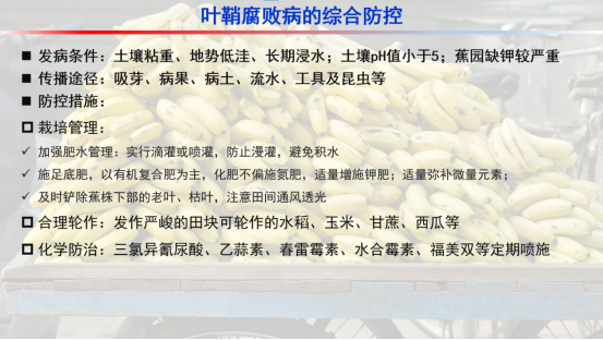 在实际生产中,蕉农应当重视使用抗病品种和无病毒种苗,并做好土壤消毒、合理灌溉和施肥。在日常巡园时,特别注意及时清理发病植株。根据病害的不同特点,选择适合的农药进行防治,如枯萎病侧重于种植抗病品种,鞘腐病和软腐病多使用抗生素类和铜制剂类农药。