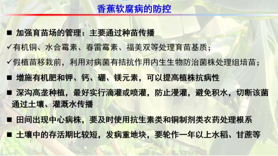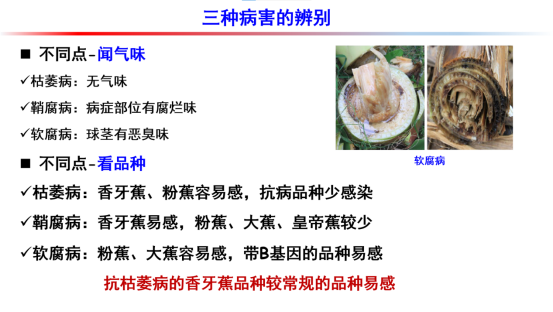 吕顺研究员提供了香蕉枯萎病、软腐病和鞘腐病的详细鉴别和防治信息。通过对比三种病害的田间表现、叶片变化、气味和发病速度,可以更准确地识别病害,从而采取针对性的防治措施。