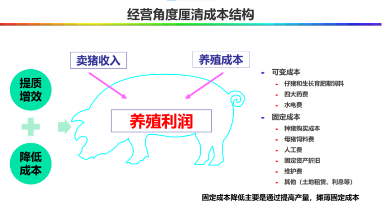 在增效的同时,刘首席从经营角度出发,分析了养殖成本的构成,提出了优化成本结构的方法。通过提高产量,摊薄固定成本;加强可变成本的控制,如饲料、水电、人工等费用的管理;采用管理会计思维,发现可控项目,提高生产指标,杜绝浪费,从而实现降本增效的目标。