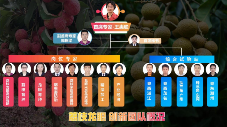 荔枝龙眼创新团队立足广东省荔枝龙眼资源禀赋,构建“科技+文化”双轮驱动发展模式,聚焦产量不稳定、市场与损耗、劳动力短缺三大产业痛点开展系统攻关。团队由首席专家牵头,汇聚华南农业大学、广东省农业科学院等多家单位的8位岗位专家,研究方向包括新品种选育、高效栽培、病虫害精准防治、保鲜与精深加工及产业经济分析等荔枝龙眼全产业链方向,同时设立覆盖粤西、珠三角和粤东三大荔枝龙眼主产区的5个示范基地。