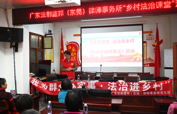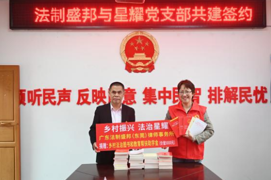 活动中,法制盛邦(东莞)律所党支部同星耀村党支部签订了《党建共建协议书》,从组织振兴、村庄法治、防贫促富、文化铸魂等方面明确帮扶项目和内容;捐赠了一批党建、法律和文化书籍,支持建设“书香星耀”文化品牌;向全村40余名党员干部、妇女群众作《妇女权益保障法》宣讲,把“巾帼维权课堂”搬到了乡村第一线;现场为村委、村民提供法律咨询、审查村规民约等法律服务,增强群众办事依法、遇事找法、解决问题用法的法治思维;实施“圆梦乡村学子”结对帮扶计划,首批资助3户困难家庭的中小学生完成学业,用实际行动践行律所“坚定不移跟党走、人民律师为人民”的坚定信念。