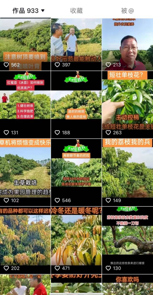 深耕荔枝产业30多年的广东省农村乡土专家补建华,创作热情极高,每日发布多条短视频,解答回应荔农关于品种改良、大小年预测、护梢修剪、暖冬管理等方面的技术咨询。