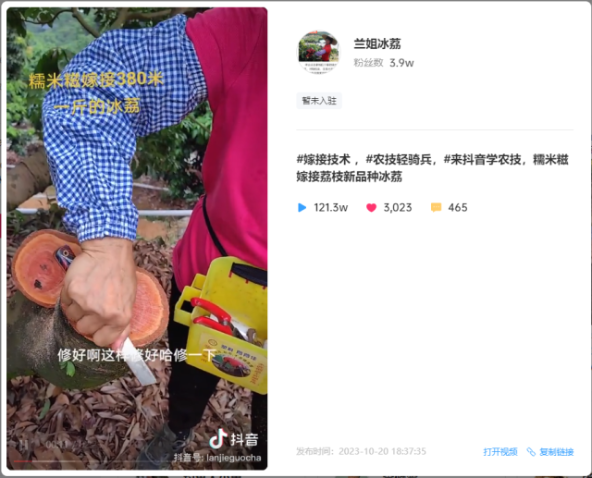 由“兰姐冰荔”发布的《糯米糍嫁接荔枝中的“爱马仕”——冰荔》技术短视频直观生动、实操性强,播出后迅速登上#农技轻骑兵 话题最热榜。抖音监测大数据显示,当前该视频播放量超120万,引来广东、广西、福建、云南等荔枝产区大量荔农纷纷留言咨询,另有1000多人把视频作为“秘籍”收藏起来继续学习观摩。
