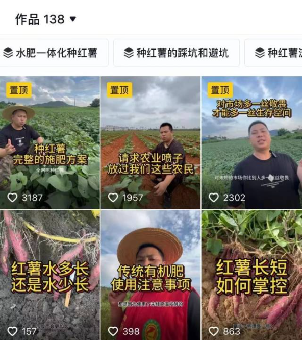 吴锦雄发现,许多农民由于缺乏技术和指导,很难走出“靠天吃饭”的困局。开设抖音账号@雄仔务农 之后,他用专业知识和经验,帮农民解决疑难问题。一条实用的红薯施肥方案,就获赞3000多次。“通过视频传农技就是这样,你要表达的,有几万、几十万、几百万人听你说。”现在,他陆续把技术视频梳理成合集,系统性地推介给有需要的种植户观看学习。