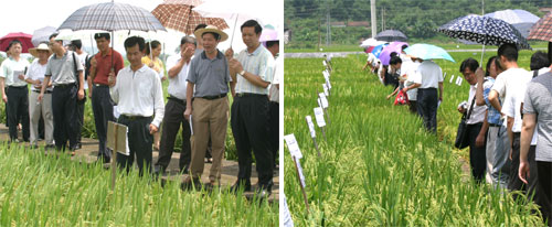 烈日下,代表们在试验现场评议水稻新品种的种植表现