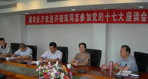 10月12日上午,省农业厅在三楼会议室召开欢送许晓珠同志参加党的十七大座谈会,热烈欢送我厅十七大代表许晓珠同志,赴京参加党的第十七次全国代表大会。