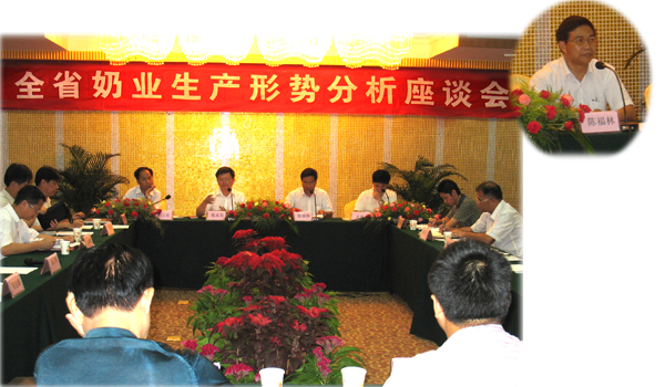 陈福林副厅长对我省奶业发展提出要求和希望:一要加快推进健康养殖。大力推进发展生态、效益奶牛业,加强标准化生产、疫病防治和环境控制,建立和健全奶业科技示范推广体系,加强科技推广力度,提高奶牛业综合生产能力;二要千方百计挖潜降耗,提高效益。充分利用本地资源间种牧草和农副产品及其加工新技术,积极探索加快发展我省草食动物的新路子,尽快改变过分依赖外购饲料的被动局面;三要加强宣传、引导消费。牛奶是营养比较齐全的食品,要努力抓好产品质量,打造品牌,充分利用各种新闻媒体,加大奶业的宣传和报道, 提高消费者信心,拉动消费市场;四,要向产业化生产模式发展。加工企业要把奶牛养殖、乳品加工与销售链结在一起,协调饲养者、加工者、经销商的利益,实现我省奶业健康可持续协调发展。