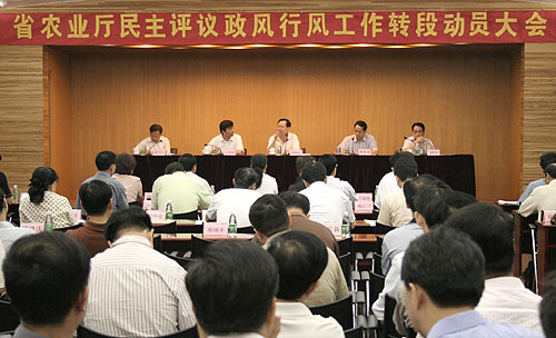 谢厅长指出,自今年4月开展民主评议政风行风工作以来,省农业厅党组高度重视,明确今年是全省农业系统政风行风建设年,带领全厅及全省农业系统干部职工,同心协力,精心组织,周密部署,高标准、严要求,扎扎实实地完成了宣传发动、自查自评和落实整改三个阶段的工作,有效地改进了全省农业系统的政风行风,进一步树立了全省农业系统良好形象,增强了全省农业系统广大干部职工依法行政的执政能力,提高了服务“三农”的工作水平,促进了全省农业增效、农民增收和农村和谐稳定,推进了社会主义新农村建设。前三阶段工作的主要特点有:一是领导重视,责任落实;二是重点突出,工作扎实;三是深入查摆,找准问题;四是狠抓整改,成效显著。厅民主评议政风行风工作取得了显著成效,主要体现在“五个进一步”上:一是为民意识进一步强化;二是执政能力进一步提高;三是工作效能进一步提升;四是服务水平进一步提高;五是队伍素质进一步增强。