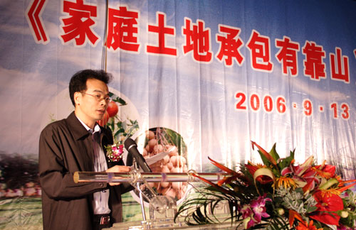 省农业厅农村经济体制与经营管理处耿静超处长在启动仪式上强调,《家庭土地承包有靠山》,这个靠山就是《农村土地承包法》,希望农民朋友们通过观看这部影片,更好地了解自己承包土地的权利和义务,知道如何拿起法律武器来保护自己的合法权益。并特别提醒农民朋友们,对照法律检查一下村里是否落实了土地承包,可查看一下自己手中是否有县政府盖印的土地承包经营权证书,是否有与村集体经济组织签订承包期限为30年的土地承包合同书。
