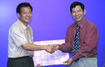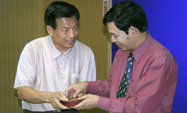 越南国家劝农中心阮青林副主任(右)和广东省农业厅潘嘉念副厅长(左)互赠礼品