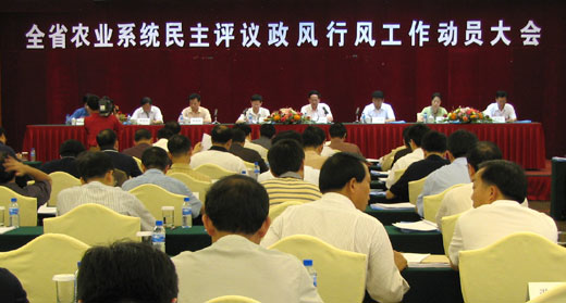 谢悦新厅长要求全省农业系统全面理解,深刻领会,认真贯彻落实动员大会和与会领导讲话精神,促进全省农业系统机关作风和队伍建设。要加强领导,落实措施,抓紧抓好,全力以赴做好政风行风民主评议工作,解决农民群众反映的热点难点问题,在社会主义新农村建设工作中作出应有的贡献。