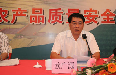 欧广源副书记在会上强调,各级党委、政府和有关部门必须从全面贯彻落实科学发展观,构建社会主义和谐社会的战略高度,以对人民群众高度负责的精神,树立全程监管理念,坚持预防为主、源头治理的工作思路,切实加强组织领导,明确责任,健全机构,增加投入,大力推进农业标准化,扎实做好农产品质量安全工作。一是突出源头治理,抓好农产品生产经营全程监控。要加强农业投入品监管,推行农产品标准化生产,从田头到餐桌实施全过程监控。二是突出监督检测,抓好农产品质量安全执法。要全面开展农产品质量安全例行监测,并结合实际工作需要开展监督抽查和专项检测;要坚持依法行政,加大执法力度,充分运用法律手段保障农产品质量安全。三是突出指导服务,抓好农业标准化和安全生产技术的推广普及。要把为农民提供指导和服务,帮助农民生产优质安全农产品作为工作的重点,让更多的农民掌握相关生产技术和操作规范,提高农产品的整体质量水平。四是突出制度配套,抓好农产品质量安全监管长效机制建设。要进一步完善法律法规和配套制度,建立健全农产品质量安全信息发布制度和农产品质量安全应急管理机制,探索建立保障农产品质量安全的长效机制。