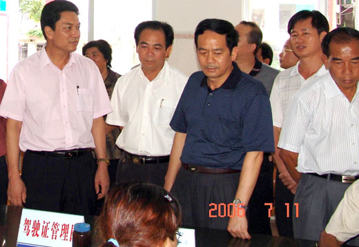 7月11日上午,谢悦新厅长率领农业厅八个处(室)负责人,在茂名市副市长陈亚春、高州市市长李上林、副书记庄家丽及其有关单位领导陪同下,兴致勃勃地来到高州市农机监理所办证大厅查检指导工作,了解了有关办证工作和农民群众对办证工作人员服务情况,充分肯定了该所规范执法、文明监理、优质服务的工作,并对高州农机监理办证窗口建设给予高度评价。同时,谢厅长勉励高州农机监理所全体工作人员要再接再厉,继续发扬求真务实的精神,内强素质、外树形象,全面提升农机监理队伍的思想素质和业务水平,为全省农机监理当好“排头兵”,为促进新农村建设做出更大贡献。