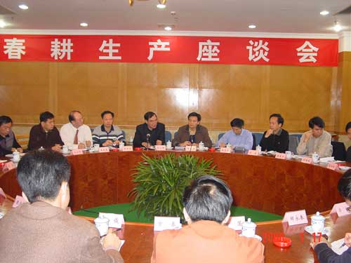 为掌握和分析今年春耕生产形势,及早谋划今年春耕备耕工作,确保春耕生产的顺利进行,最近我厅在广州召开了春耕生产座谈会,参加会议的有我厅种植业系统的领导和部分地级以上市农业局代表,同时会议还邀请了省气象、水利、农业教学和科研单位的有关专家参加。蔡汉雄副厅长到会作了重要讲话,对抓好今年春耕生产作了部署。