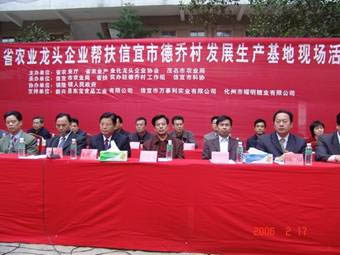 两天来,潘嘉念一行分别在德乔村、扶参村举行了省农业龙头企业帮扶群众发展生产基地现场会。新兴县东宝食品工业有限公司负责人在会上向当了群众分析了大肉姜市场形势,并现场与农民签订了今年大肉姜保护价收购合同。信宜市农业局的农艺师向农民介绍了大肉姜生产技术要点。省农业龙头企业新兴县东宝食品工业有限公司、信宜市万事利实业有限公司、化州市耀明糖业有限公司还分别向德乔村、扶参村各捐资1万元,扶持贫困农民购买姜种,作为建设肉姜生产基地的启动资金。省农业厅给这两条村赠送了二套农村科技图书,给德乔村安排了1万元培训经费。信宜市科协也向两条村赠送了农业科技光碟。