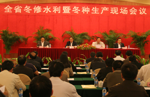 今年以来,防汛和抗洪救灾工作取得了“无一座水库跨坝、无一条大堤围溃堤、没出现群死群伤”的胜利。目前,全省各项水利重点工程总体进展顺利,城乡水利防灾工程加快推进,病险水库除险加固工程稳步实施,农村饮水安全工程有序开展。冬春季节是兴修水利、整治农田的黄金季节。最近,国务院出台了扩大内需的十大措施,其中一项就是加快农村基础设施建设,省里也将出台相关政策,这为我们推进农村水利基础设施建设提供了良好的机遇。各地要抓住这段有利时期,把冬修水利和冬种生产有机结合起来,大力推进防灾减灾工程、农村饮水安全、病险水库除险加固、灌区改造、小流域治理等重点工程建设,加快以农林水利为重点的农业基础设施建设,提高耕地的抗灾和综合生产能力,为全省农村建设更高水平的小康社会提供更好的水利基础保障。