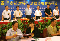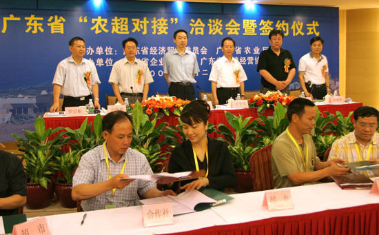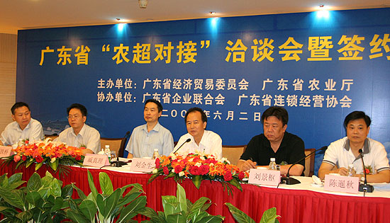 今天(6月2日)上午,广东省在广州举行“农超对接”洽谈会,全面启动“农超对接”试点工作。这是省经贸委、省农业厅为积极发展农产品现代流通方式,推进鲜活农产品“超市+基地”的供应链模式,引导大型连锁超市直接与鲜活农产品产地的农民专业合作社对接的一项有效措施。届时,试点企业间将加强合作,通过大幅度提高鲜活农产品产地的直接采购比例,实现农产品生产者、销售者、消费者三方共赢。省农业厅副厅长刘金生、省经贸委巡视员戚真理、农业部农村合作经济经营管理总站副站长赵铁桥等出席会议并讲话。