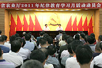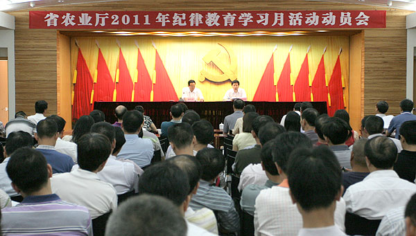 8月15日下午,广东省农业厅召开2011年厅纪律教育学习月活动动员大会,通过教育学习,进一步强化群众观念,改进工作作风,增强党员干部的廉政勤政意识,更好地服务经济社会发展大局。省农业厅厅长、党组书记谢悦新出席会议并作动员讲话,省纪委、省监察厅派驻省农业厅纪检组组长、监察专员,厅党组成员王力伟代表厅党组对纪律教育学习月活动的具体工作作了部署。厅机关全体公务员及事业单位全体干部参加了会议。