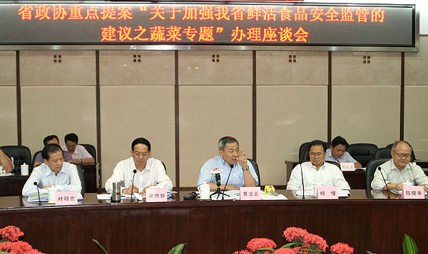 下午,省农业厅谢悦新厅长主持召开了省政协重点提案“关于加强我省鲜活食品安全监管的建议之蔬菜专题”办理座谈会,黄龙云主席在座谈会上作了重要讲话,省农业厅程萍副厅长介绍了提案的办理情况,各会办单位等分别汇报了会办情况。黄龙云主席充分肯定了《关于加强我省鲜活食品安全监管的建议》提案(第20110158号)主办单位及各会办单位的工作,强调食品安全不但事关民生这个大问题,同时也是政府首要的基本职能之一,更是幸福广东的基础性重要指标,要求各相关单位要切实提高对食品安全的认识,进一步加大对农产品质量安全工作的资金支持,着力强化和推动全省农产品质量安全监管水平的进一步提高。