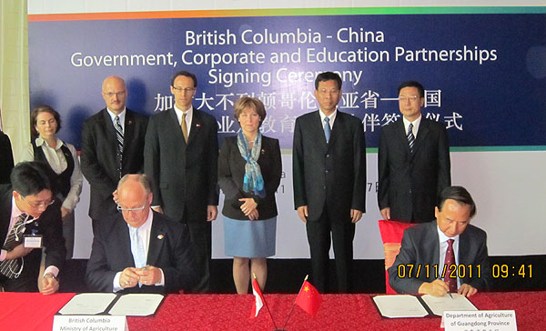 广东省农业厅与加拿大不列颠哥伦比亚省农业厅签订农业合作备忘录