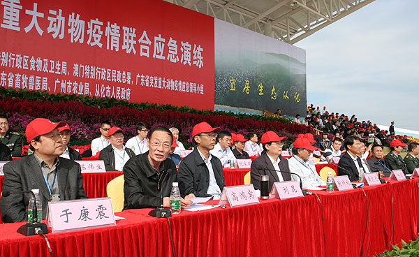 农业部有关司局、中国动物疫病预防控制中心、中国兽医药品监察所、中国动物卫生与流行病学中心负责人,解放军总后勤部卫生部、解放军疫病预防控制中心、武警总部后勤部卫生部、军需物资部有关负责人,各省区市农牧部门有关负责人,黑龙江、广东农垦总局有关负责人,香港特别行政区食物及卫生局、澳门特别行政区民政总署有关负责人,以及广东省直有关单位、各地级以上市农牧部门负责人共200余人现场观看了演练。