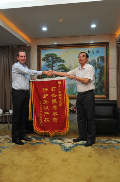 螺螨酯是拜耳作物科学(中国)有限公司获得知识产权保护的专利产品,主要用于柑桔上防治螨类害虫。Rob Hulme(贺远波)先生对我省农药打假工作所取得的成绩表示高度赞赏,对广东省农业厅、广东省农药检定所在“螺螨酯”专项打假工作中所做出的努力表示感谢,并向省农业厅赠送了“打击假劣农药保护知识产权”的锦旗。