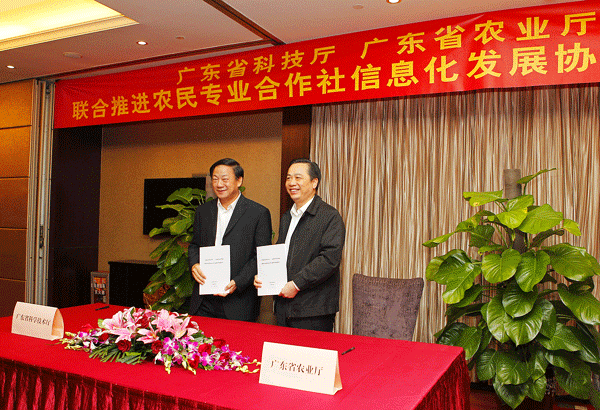 12月11日下午,省农业厅与省科技厅联合推进农民专业合作社信息化发展协议签约仪式在广州举行。省农业厅厅长郑伟仪与省科技厅厅长李兴华分别代表双方签订协议。
