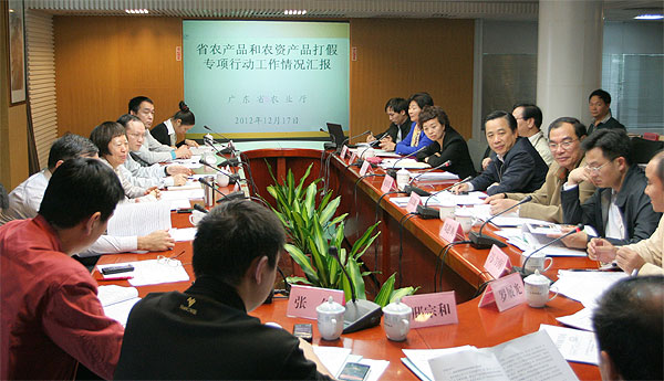 12月17日下午,广东省“三打”办第四检查考核组组长、省检察院专职检查委员会委员林瑶卿率队到省农业厅进行“三打”专项行动检查考核。检查考核组听取了省农产品和农资产品打假专项行动工作情况汇报,就厅有关领导“三打”工作表现进行了民主测评等。省农业厅厅长、省委农办主任郑伟仪、厅党组书记陈家记、省农产品和农资产品打假专项行动领导小组成员参加了汇报会。
