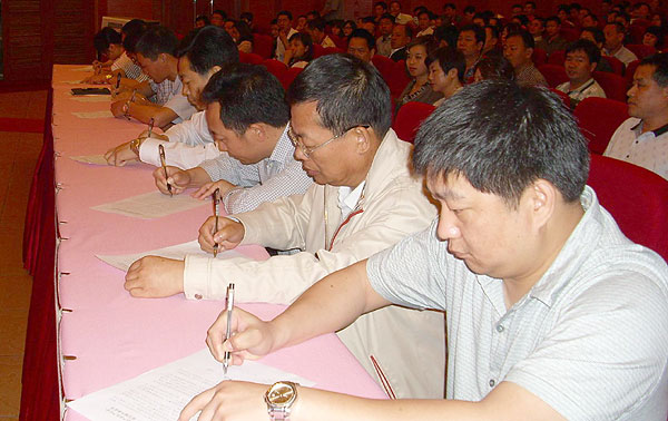 广东省2013年农机购置补贴政策解读培训班近日在广州市举行, 400多家农机生产企业代表和经销商代表参加了培训,期间还举行了生产企业、经销商代表签订“承诺书”仪式。省农业厅副巡视员陈华富,省纪委监察厅驻农业厅纪检组副组长监察室主任张利安,省农业厅农机化办主任郑宏宣、副主任黎映驰、刘亚平,省农机试验鉴定站站长姚运仕、副站长熊元芳、马志光,省农机化技术推广总站副站长刘胜敏,省现代农业装备研究所副所长李君略等出席了会议。会议由郑宏宣主任主持。