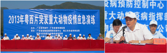 10月25日上午,由省农业厅、省畜牧兽医局主办,省动物疫病预防控制中心、阳江市农业和林业局、阳春市防制重大动物疫病指挥部承办的“2013年粤西片突发重大动物疫情应急演练”在阳春市举行。省农业厅党组成员、副厅长、省畜牧兽医局局长郑惠典宣布演练开始并作总结讲话,阳江市副市长李孟志、省农业厅应急办主任郭仁东、阳春市副市长余秀坤出席并讲话,省动物卫生监督总所所长、省动物疫病预防控制中心主任屈源泉,阳江市副秘书长周国庆,阳江市农业和林业局局长陈仕欢等领导出席了演练活动。演练活动由阳春市委常委谢兴标主持,疫情应急演练操作流程由阳春市农林水产局朱运仪局长、梁敏副局长主持。