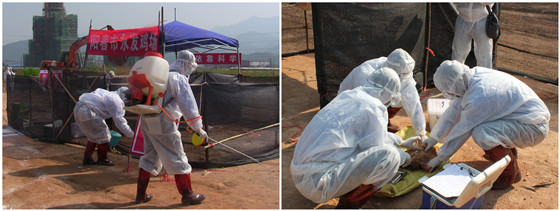 此次演练模拟阳春市某鸡场发生高致病性禽流感疫情,紧急启动Ⅳ级应急响应。根据突发重大动物疫情应急预案有关规定,省、市、县三级有关部门联合开展疫情紧急处置。100余名参演人员分成疫情诊断组、封锁检疫组、治安保卫组、免疫监测组、医疗防护组、市场监管组、扑杀处理组、消毒灭原组、技术专家组等9个演练小组。各演练小组按照《中华人民共和国动物防疫法》、《重大动物疫情应急条例》、《国家突发重大动物疫情应急预案》、《高致病性禽流感防治技术规范》、《全国高致病性禽流感应急预案》、《广东省突发重大动物疫情应急预案》和《阳春市突发重大动物疫情应急预案》等有关规定和技术要求,围绕疫情报告与先期处置、应急响应与应急处置、响应终止与善后处理等三个科目,进行了模拟实战演练。各有关部门快速反应,迅速行动,有力有序有效地开展突发重大动物疫情应急处置工作,完成了各项演练任务,取得了预期的演练效果,演练活动取得了圆满成功。