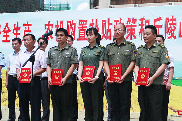 活动中,还分别为我省获得2014年全国“平安农机”示范县(区)的广州市从化区、珠海市金湾区、兴宁市和龙门县颁发了牌匾,为获得农机安全监理“示范岗位标兵”的个人颁发了证书。