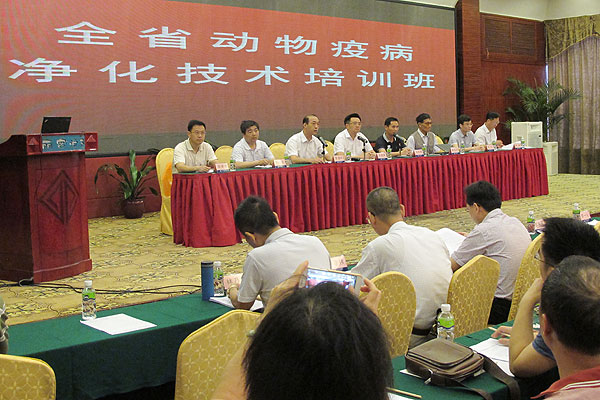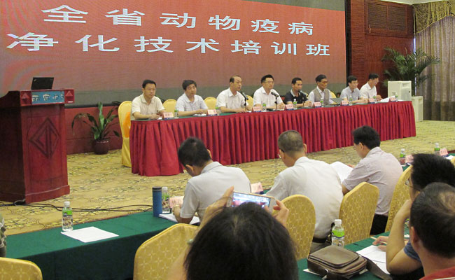 5月26日,广东省农业厅在江门市举办全省动物疫病净化工作培训班,省农业厅党组成员、副厅长,省畜牧兽医局局长郑惠典出席会议并讲话,山东农业大学崔治中教授、华中农业大学吴斌教授分别对禽白血病、猪伪狂犬病净化技术授课讲解,华南农业大学曹伟胜副教授、省农科院动物卫生研究所魏文康研究员和省动物疫病预防控制中心陈平洁博士分别对禽白血病、猪伪狂犬病样品检测和净化评估程序进行培训,温氏南方家禽育种公司和阳江宝骏畜禽养殖公司分别介绍禽白血病和猪伪狂犬病净化经验。会议由省畜牧兽医局副局长罗道栩主持。全省各地级以上市、顺德区农业(畜牧兽医)局、动物卫生监督机构和动物疫病预防控制机构的负责人与技术骨干,以及全省原种猪场、祖代以上种禽场负责人共计200余人参加了培训。